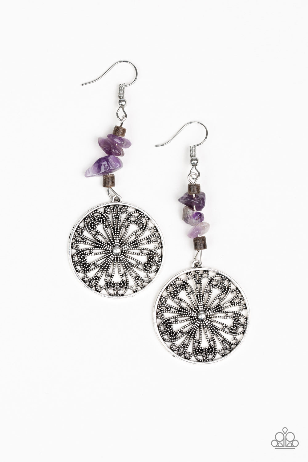 Threaded along a metallic rod, bits of purple rock and wooden beads give way to a shimmery silver disc swirling with floral detail. Earring attaches to standard fishhook fitting.