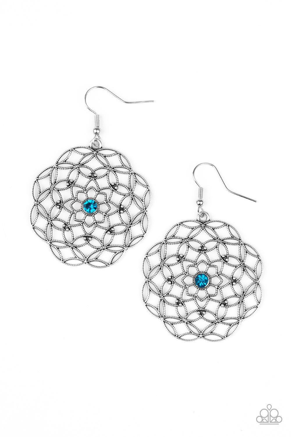 Dotted with a glittery blue rhinestone center, studded silver filigree blooms into an enchanting floral frame. Earring attaches to a standard fishhook fitting.
