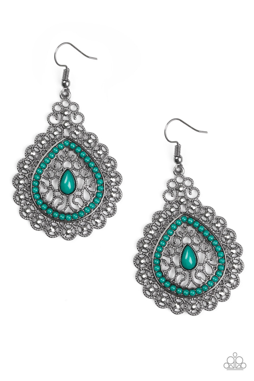 Regal gunmetal filigree climbs a teardrop shaped frame, coalescing into a glistening frame. Dainty green beads adorn the center of the frame, while glittery hematite rhinestones embellish the outer frame for a refined finish. Earring attaches to a standard fishhook fitting.