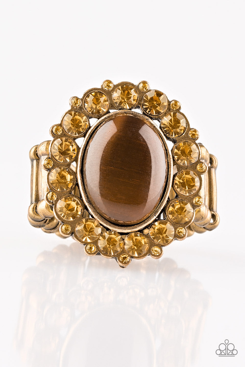 Golden topaz rhinestones spin around a glowing brown moonstone center, creating a whimsical floral frame atop the finger. Features a stretchy band for a flexible fit.