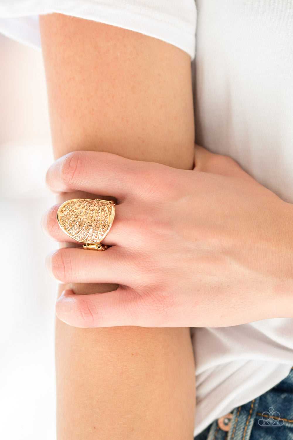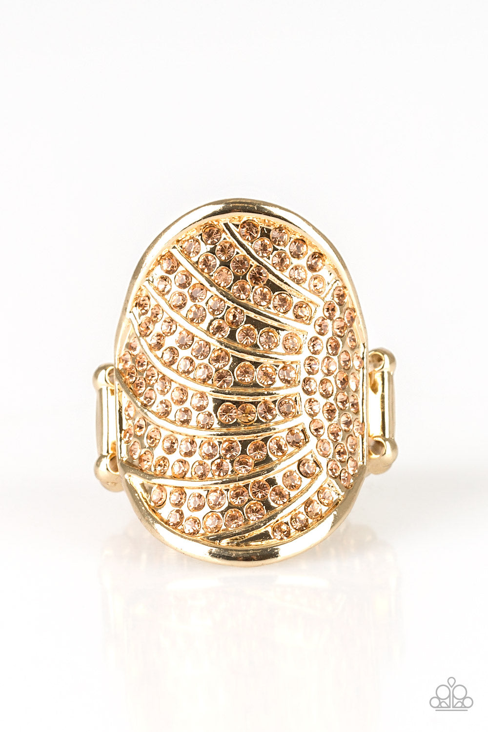 Radiating with gold linear textures, a circular gold frame is encrusted in countless peach rhinestones as it folds around the finger for a timeless look. Features a stretchy band for a flexible fit.