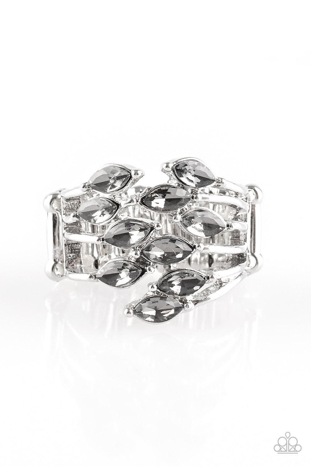 Featuring regal marquise style cuts, smoky rhinestones attach at the ends of dainty silver bars. The glittery gems collect at the center, creating a glamorous centerpiece atop the finger. Features a stretchy band for a flexible fit.