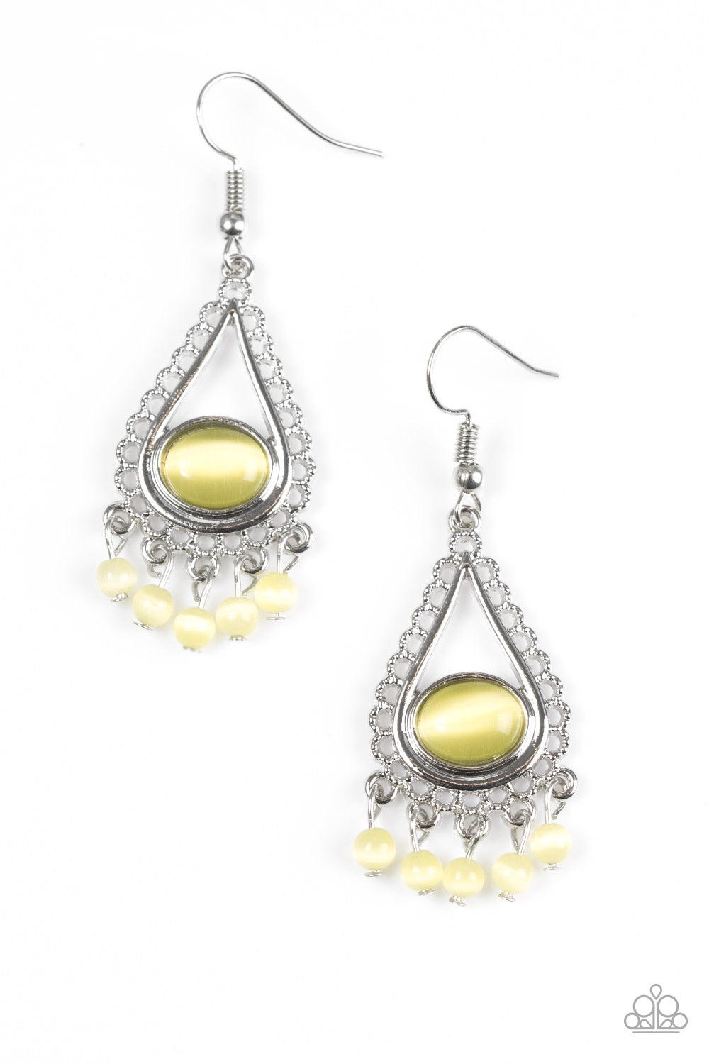 Infused with a yellow moonstone center, dotted silver filigree loops around a teardrop frame, creating a frilly edge. Glowing yellow moonstones cascade from the bottom of the teardrop, creating a whimsical fringe. Earring attaches to a standard fishhook fitting.
